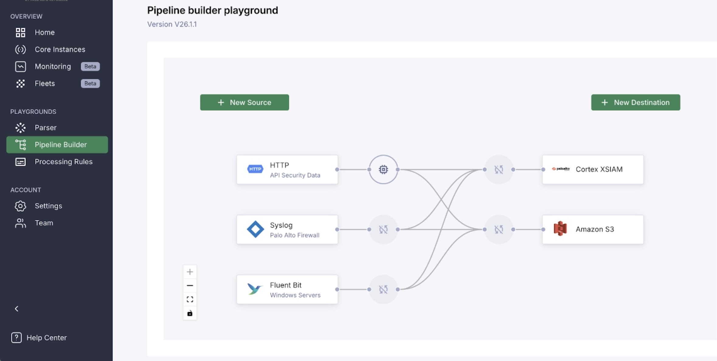Cortex XSIAM is now available as a destination in the Telemetry Pipeline user interface. Data from hundreds of sources can be sent to Cortex XSIAM in a few clicks, without the complexity of custom APIs. It pre-formats logs to match Cortex XSIAM requirements, enabling data to hit the Cortex XSIAM data lake already parsed and ready for the XQL engine.